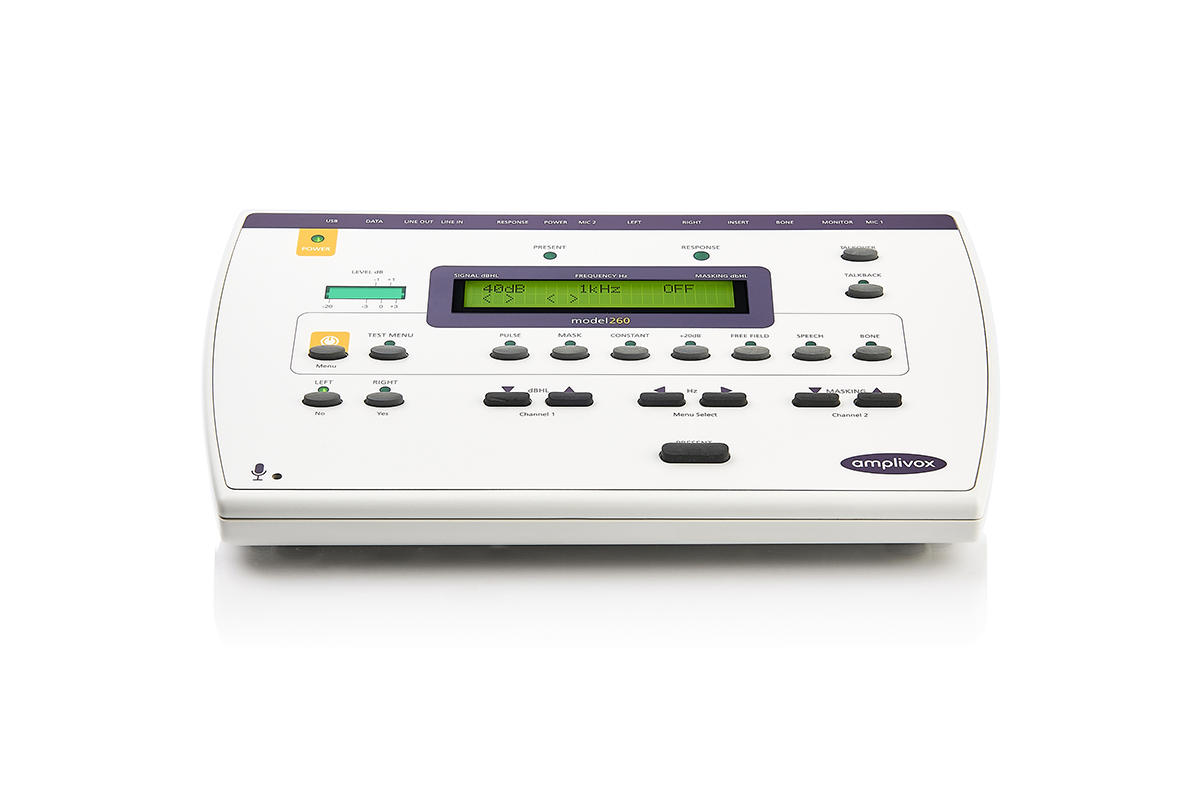 Amplivox 260, hava iletimi (AC), kemik iletimi (BC), maskeleme işlevi ve konuşma testlerini içeren uygun maliyetli, taşınabilir ve güvenilir bir tanısal odyometredir. Kompakt yapısıyla Model 260, odyometrist ve odyologlar için ideal bir araçtır.