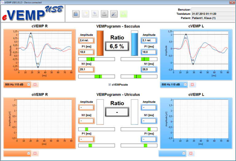 eVEMP ‘deki benzersiz bir özellik MFA‘dır (Çoklu Frekans Analizi), tone burst alternatif frekanslarla (500,750 ve 1000 Hz) sunulur. Aynı anda tek bir kas kasılması ile 3 frekansta ölçüm alınabilir. 3 frekansın birbirleri ile karşılaştırmaları ve oranları ayrı ayrı hesaplanır. Morbus Meniere‘de maks. yanıt daha yüksek frekansa (1 kHz) kaydırılır.